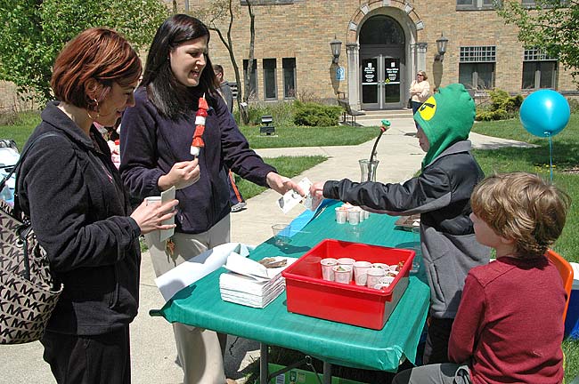 On Friday, April 24, Antioch School’s Younger Group opened their stores on the Bryan Center lawn, where they hawked small toys, clothes and snacks. Isaac Stiles (in the hood) and Jonah Summers sold strawberry-marshmallow-watermelon fruit kabobs at the store ‘Caveman Campfire Snacks’ to US Bank employees Tracy Schlenker and Dione Simon using Antioch School special money. (Photo by Suzanne Szempruch)