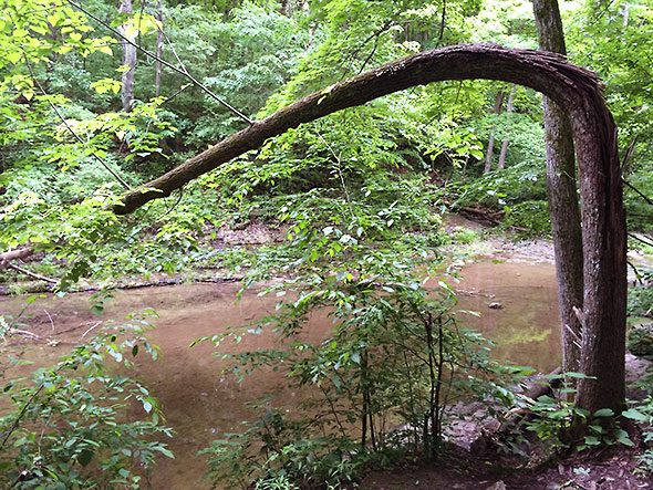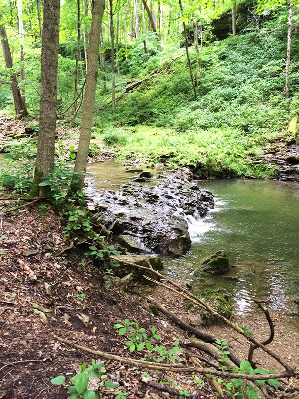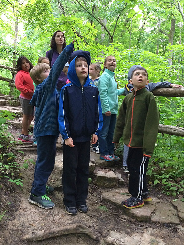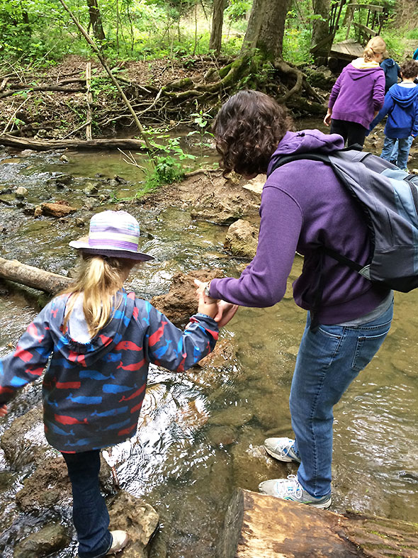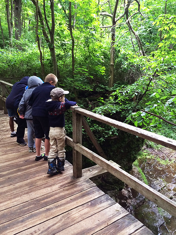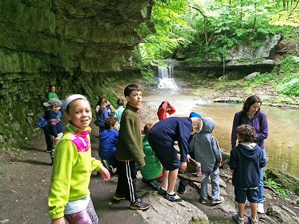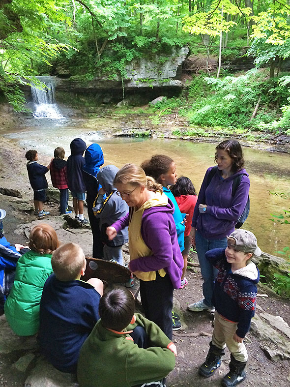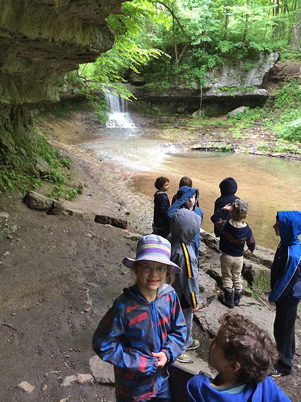 By 9am, however, the promise of a vigorous walk among forest and fauna overcame the fear of a soaking and the group was off. They exited out the front door—three adults and twenty children—and headed south on Walnut Street then west on Limestone. We rendezvoused with my son on Limestone—dropped off by his dad—and, after our young man promised to stay close and keep pace, we proceeded down the bike path to the main entrance of Glen Helen. After a review of hiking ethics, we entered the glen at the stairwell near the Trailside Museum. We crossed the Yellow Springs Creek first—pausing to count the half dozen or so fish swimming south of the bridge—then proceeded up the Birch Creek path toward the waterfall known as the Cascades.