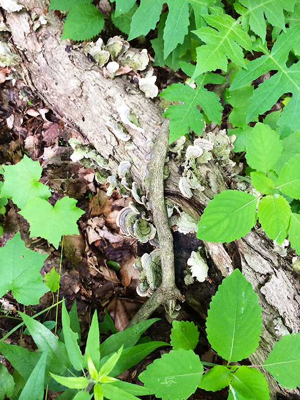 Though we saw only the occasional bird take wing and squirrel out foraging, we had plenty to draw our attention. The glen was dressed in fresh spring green, the leaves of its canopy still tender and translucent. The carpets of moss were particularly thick on the glen floor, snow white violets dotted bouquets of green leaves, and various forms of fungi sprouted from felled trees and floor litter. The wet conditions of the past day or so had transformed the glen with subtle detailing but the kind that intrigues and charms.
