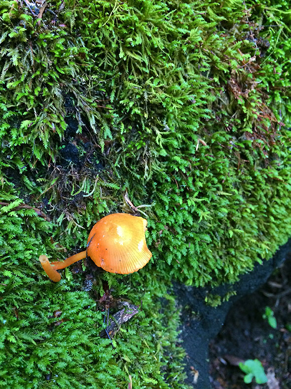 The children demonstrated their own familiarity with the glen’s features and pointed out several findings including caves and overlooks, clusters of eggs on leaves and the many mushrooms springing from the damp forest floor. Rare and ethereal, most appeared in clusters of pale pearl but two toadstools popping up from a carpet of moss were an bright glossy orange.