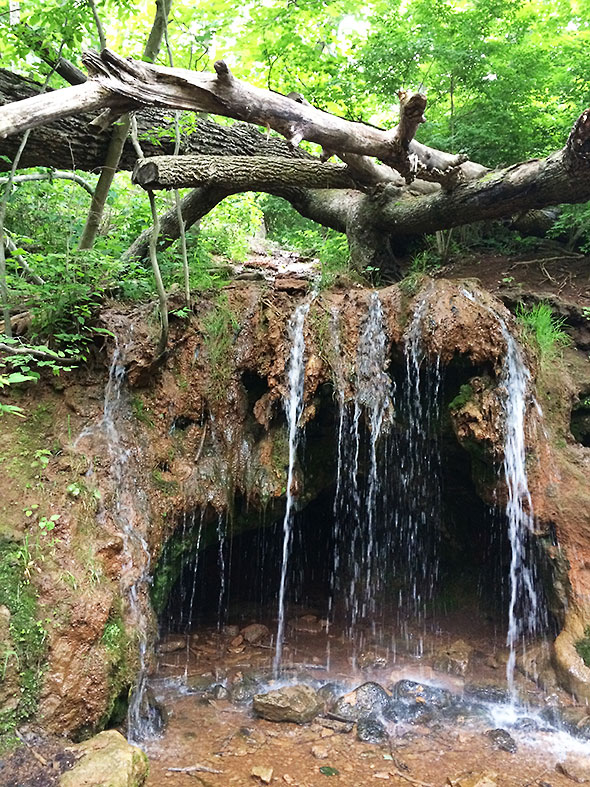 We took one last pause lining up along a retention wall of the Old Dam and listening to the water fall over the mouth of the Grotto, the west-facing cave that my children call Rainbow Rock. Kicking off our final push home, we crossed the Yellow Springs Creek avoiding the washed out bridge to pick across creek rocks until we reached the western slope that would return us to the bike path above.