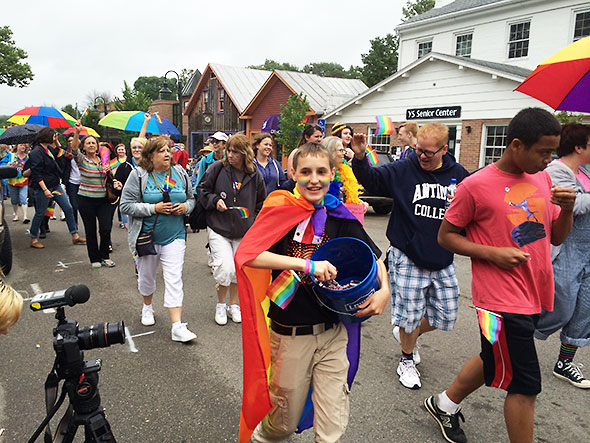 A rain drizzled down on the chilly October night as I crossed the Antioch College campus. Walking with a crowd from the horseshoe drive off of Livermore Street toward the Foundry Theater on Corry, I left a dying bonfire while ahead the theater lit like a beacon. Awashed in the hues of a rainbow, the theater was set to host a rally for marriage equality and I was there to join my voice to the call.