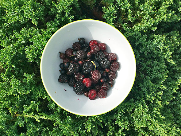 Often eaten straight off the vine or by the handful from a kitchen countertop container, this windfall fruit been happily heaped into our daily diet. Salted with sprouts or splashed into a pot of creamy yogurt, the black caps have brought sweet and savory notes to our fare.