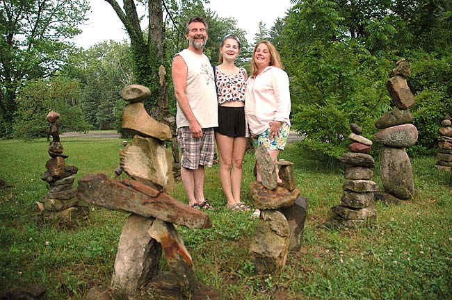 The Village of Yellow Springs Public Art Commission will award Tim and Kelley Callahan, here with their daughter Lucy, the first Village Inspiration and Design Award, or VIDA, on Friday, June 19, 8 p.m. at the YSAC Gallery. At their home on the corner of Corry Street and Glen View Road, the Callahans have built ever-changing stone piles, or cairns, for the last 20 years. (photo by Lauren Heaton)