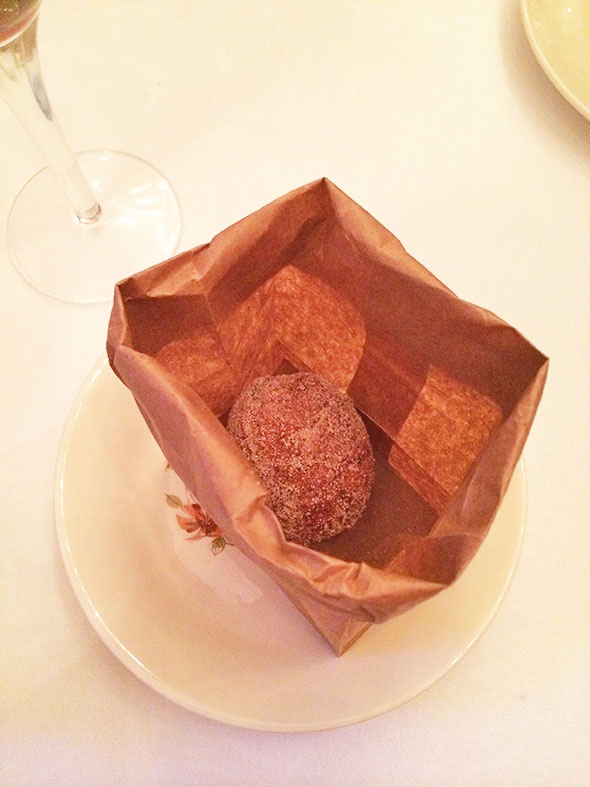 We learned in the fifth course to not doubt Chef Amber’s uncanny instincts. She proudly announced the sixth course herself: a cake donut hole with rhubarb compote. Here is where Amber knew the meal would take an emotional turn. Donuts are forbidden fruit for celiacs; it is extremely rare to find the confection made with a satisfactory substitute to wheat floor. Chef Amber had recently happened upon a naturally occurring culture of yeast and used it to create dough that would make a light airy dough without gluten. The donut itself was delivered in an oiled paper bag dusted with cinnamon sugar. It brought people to tears it was so good and everyone lost their composure cleaning crumb and compote off their plate with their fingers and lip smacking the traces clean.
