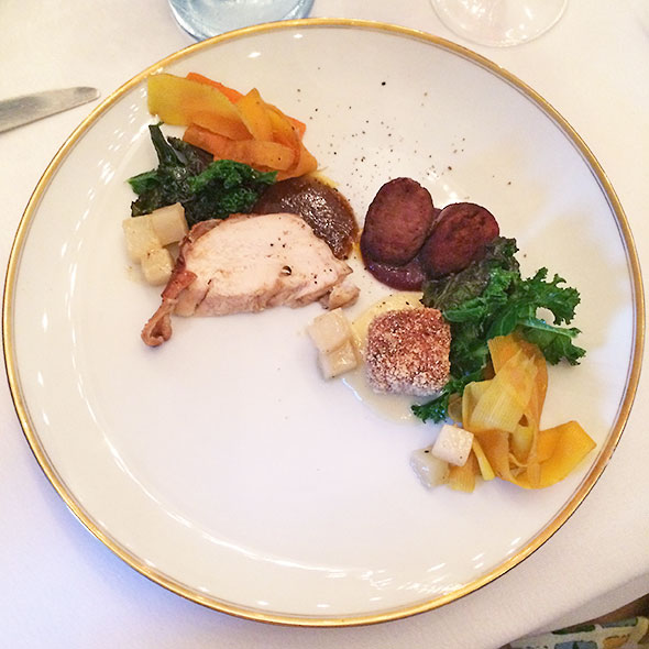 Still swooning over the fish, we were treated next to a plate of chicken made three ways: smoked sausage, rillette croquette, and rotisserie. each with their own sauce and vegetable. The tastings were arranged in an elegant arch along the plate each memorable variation accompanied by its own sauce and vegetable.