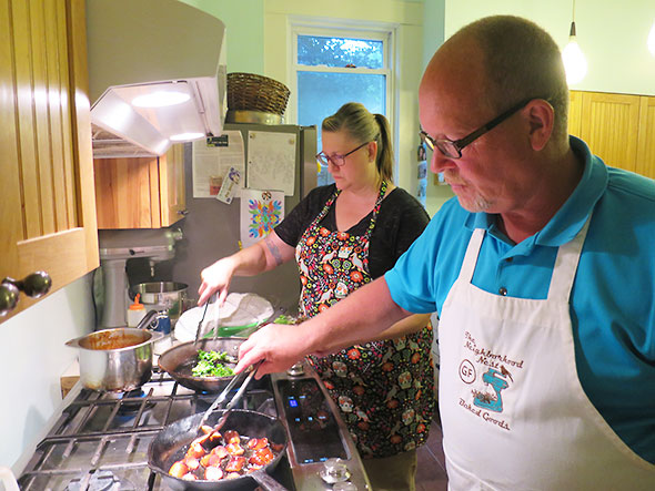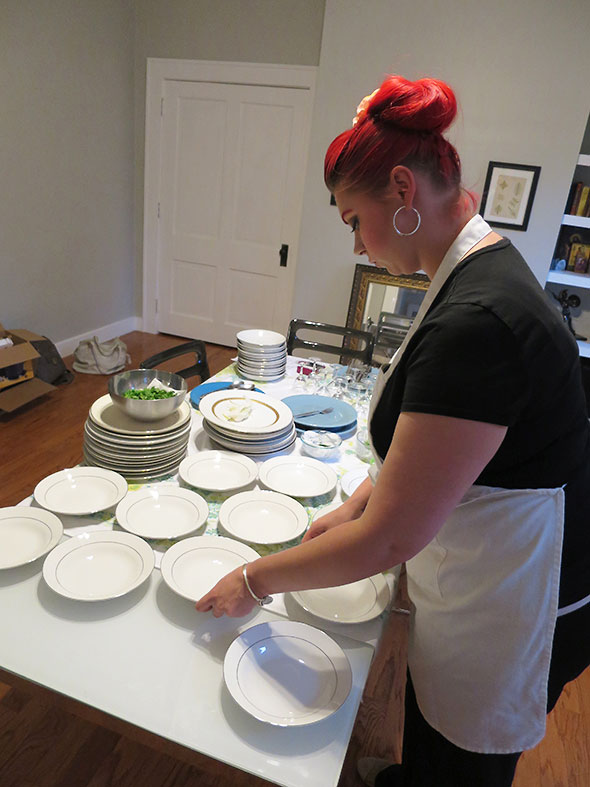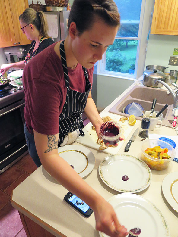 The entire production—a starter, a fish plate, meat, vegetable plate, an intermezzo, and two deserts—was created by a crew of four. Chef Amber was accompanied by Chef Olivia Tipton, a graduate of Johnson & Wales with a bachelor of science in culinary nutrition and currently associate research and development chef at Jeni’s Splendid Ice Cream in Columbus OH. Chef Olivia and Chef Amber collaborated on the menu which highlighted Chef Olivia’s specialty quickling, her word for quick pickling, in addition to Chef Amber’s breakthrough gluten free confections. The two other able lieutenants were Stephanie Downs assisting as server and Gerry Tipton—Amber’s husband of thirty years—on duty as dishwasher, heavy lifter, and sous chef.