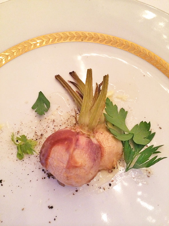 When the plates arrived at our place setting, Chef Olivia would describe the dish…the ingredients, something of their preparation, and answers any of our burning questions. Chef Amber emerged from the kitchen with the fourth course—pan roasted baby turnips flavored with cultured butter, salt, and a caramelizing heat.