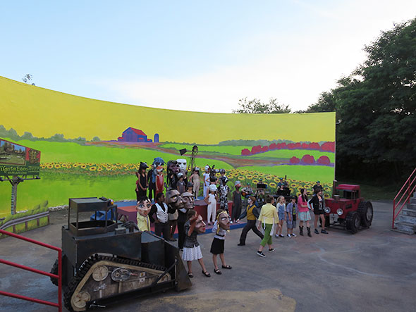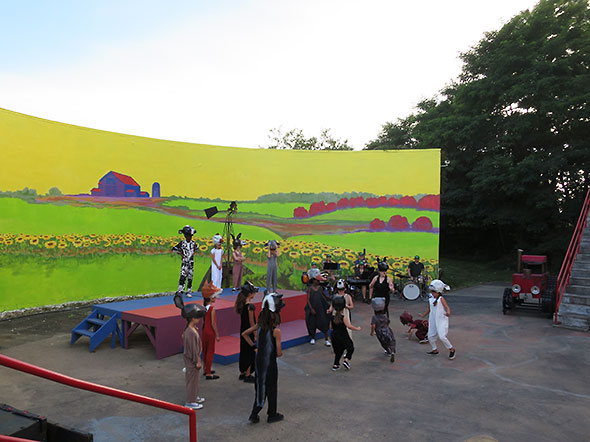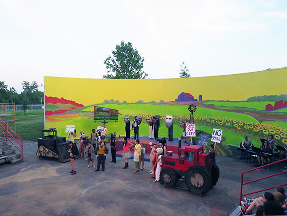 Just behind the south wall mural of the amphitheater, fields that once were a golf course are being transformed to an urban organic farm. That juxtaposition is a special irony not lost on the play’s author and production crew. The play acknowledges the many conflicting opinions on what constitutes natural use of the land and admits to the compromises that we make. The birds and bulldogs that live in the green space of Antioch College have been joining the green-billed farm band in their evening serenade. The native voices joined with the voices of our children hint of the true beauty when harmony is achieved.