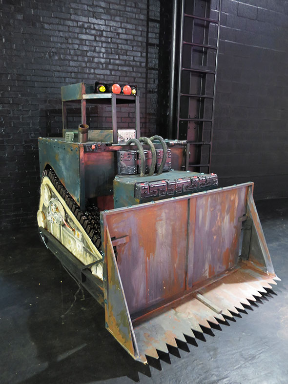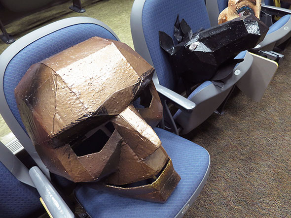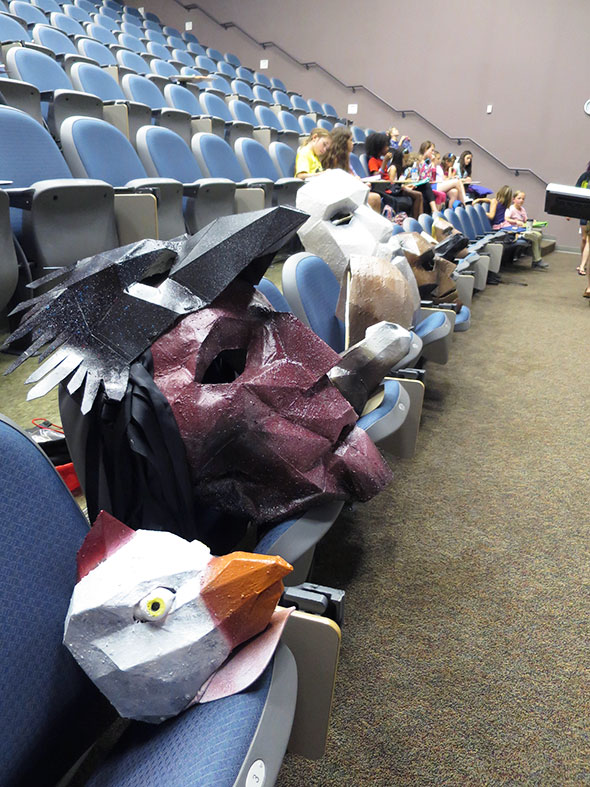 thought out. The bulldozer and tractor are made from recycled materials…seed starter trays, aluminum shades, trash can lids, and assorted plastic appliance cases. One tears askew while the other combs the fibers of the land. The assembled costumes are most extraordinary. Materials reflect character. The birds’ flowing drapes and feathers lift and float as crow, goose, hen wing about the stage. The developers and politicians wear slick fabrics brocaded in busy patterns. Continuing the theme of Recycle-Reuse, Ayn Wood and Matt Brown have fashioned an extensive eclectic set of masks and headpieces. Almost every character has one, and the evocative collection are united in texture and theme. Charmingly, they range a fierce spectrum of character from odd soul to endearing silliness.