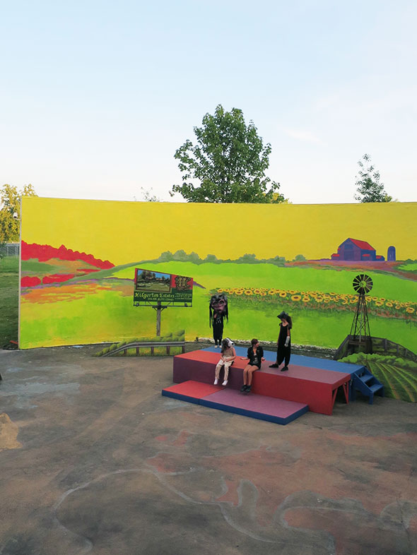 The production met with conflict itself on stormy Friday. Performances take place the Antioch College amphitheater—dressed once again in a stunning panoramic mural by Pierre Nagley and Travis Tarbox—except in case of bad weather when the show will go on inside of the Foundry Theater. Though Thursday night was clear, actors arrived on call to the clap of thunder and the fall of a halting rain. Director Beal had a moment’s doubt bringing the production inside but in the next moment told her cast and crew, “You’ve got this.” Indeed they did. The night’s performance was remarkably tight and natural as the actors took the Foundry Theater stage and made The Farm their own.