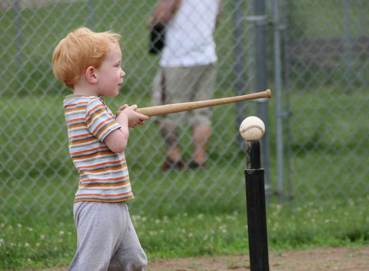 One of the last players to bat was Corbin Hyatt, a 2-and-a-half year old. He’s a wiry, strawberry-blonde, freckled-faced red head with the spirit and energy of a Viking warrior. He plants himself decidedly, firmly next to the tee, his legs spread wide — he is so sturdily anchored, you couldn’t have knocked him over with a two-handed shove. He looks at his mom, Naomi Hyatt, squatting fifteen feet away, her camera raised.“Are you watching out for me?” Corbin asks her.