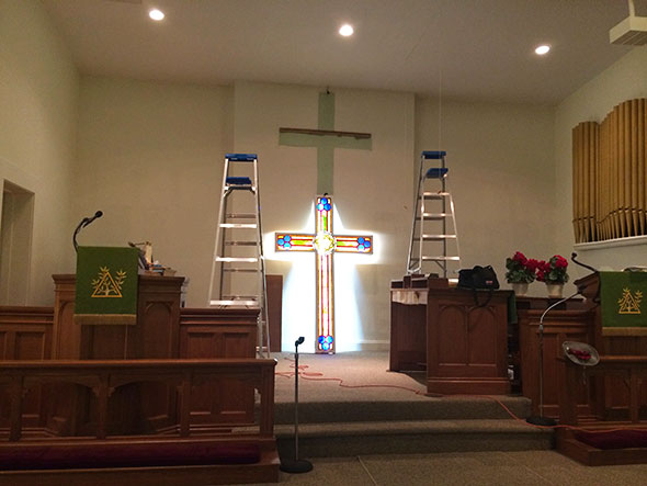 How many Methodists does it take to change a lightbulb? This question may seem like the lead-in to a joke but the Yellow Springs Methodist Church, 202 S Winter Street, tested its premise just last Saturday. For 35 years, a stained-glass cross has hovered above the altar in the church’s santuary. The fluorescent bulbs within the cross burned bright for decades. However, over the summer, my husband Jeremy noticed a problem whenever he opened up the church for Sunday Service. The right arm of the cross flickered…often long after its light had been turned on. As a member of the board of trustees, he brought up his concern at a monthly meeting. There, the other trustees agreed that the light bulb was near failure. They assigned a crew of three to attend to the matter.