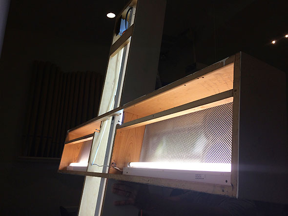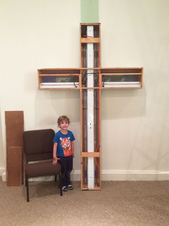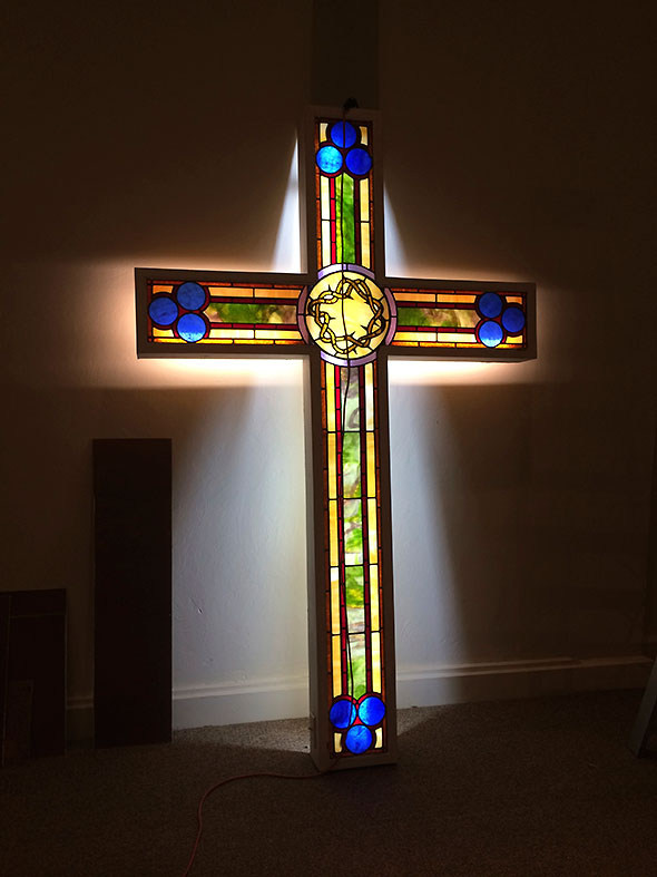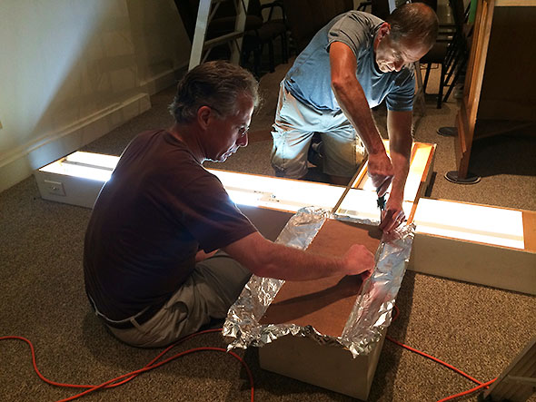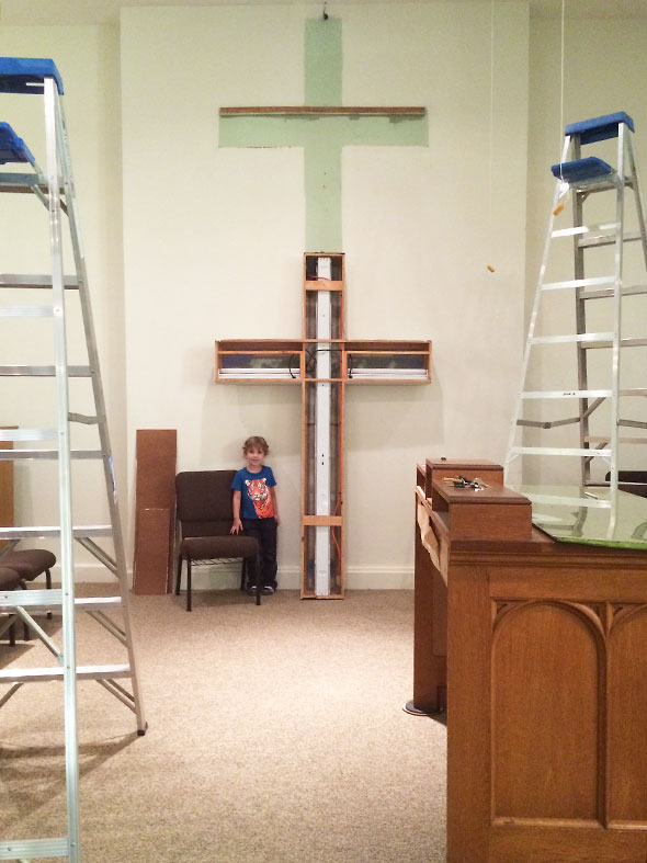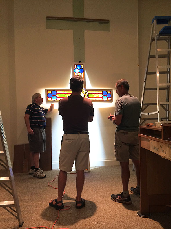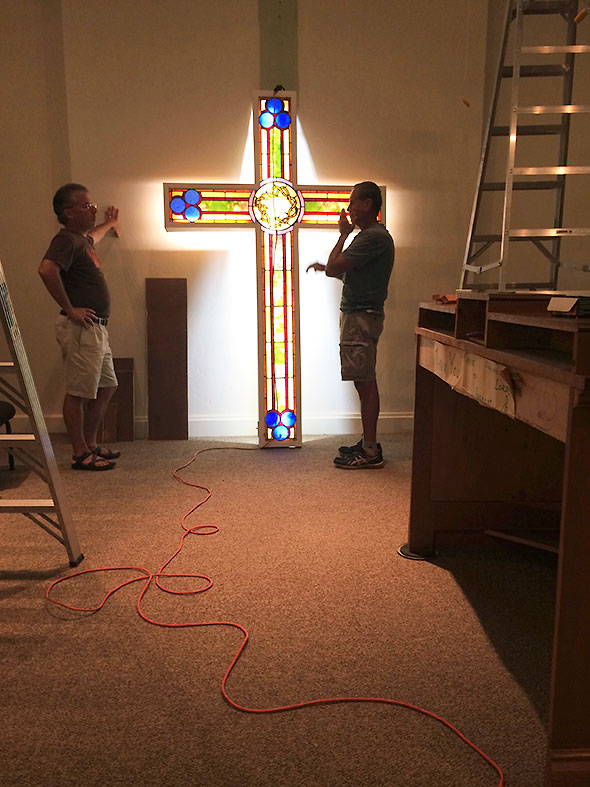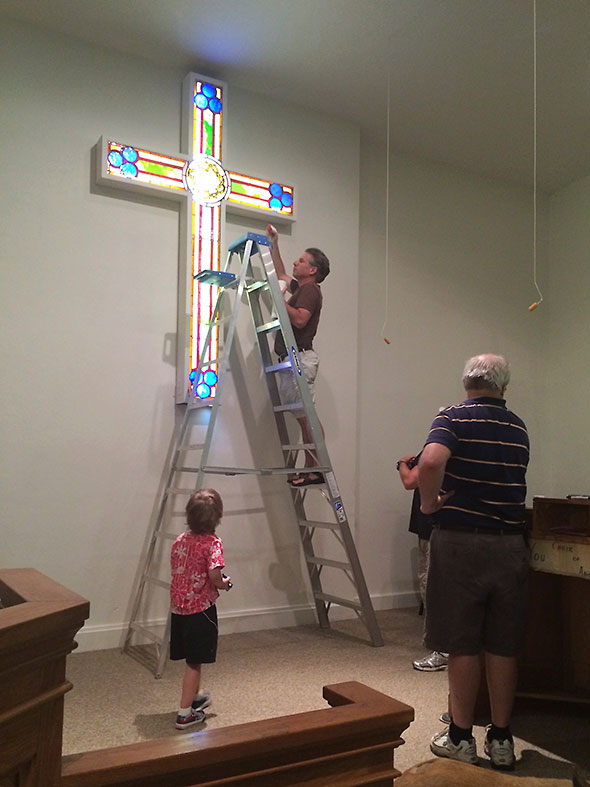 When the crew reconvened Saturday at the appointed hour, the children and I tagged along to watch the event. Gary Blevins had succeeded in his task to replace the antique fixtures with modern ones and was happy to report that the cross was much lighter after the rehab. He did however note an area of disappointment. The light bars along the arms did not illuminate their boxes evenly. The light cast brightly from the bottom but the reflected light at the top was dimmer. The horizontal bars were also noticeably dimmer than the vertical bar. In brief consultation, the men considered moving the light fixture or, alternatively, changing the horizontal bulbs for ones with a different color spectrum. I considered dropping in a comment about placing mirrors within the horizontal boxes when Gary Blevins spoke up with a much more practical alternative. He suggested covering the inside surface of the back panels with aluminum foil before we screwed them back into place. We placed the foil shiny side toward the stained glass so that it would mirror the light source and increase the strength of the reflected light within the box. The internal illumination would even out as a result.