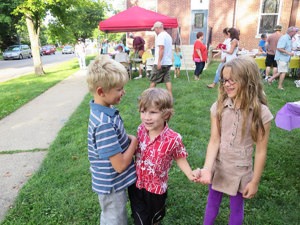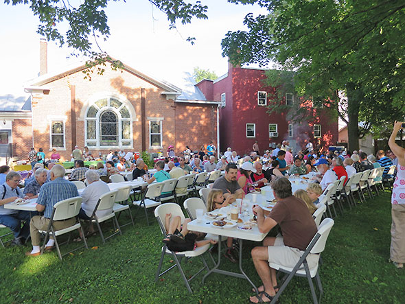 Outside, preparations for the Saturday night barbecue were well underway. Church members—led by the Crawford family—were busy in the assembly and provisioning of the outside barbecue pit and dessert tables. We returned later that day to partake, ordering two chicken dinners and one vegetarian to split four ways. Many villagers were in attendance on the pleasant summer evening, and Jeremy delighted in retelling the week’s adventures with the stained-glass cross. He and our son took noticeable pride in their contributions to the fulfilling day. When the evening rolled to a close, our son inserted himself in the fray again asserting himself into wrangling peers, tables, and chairs.