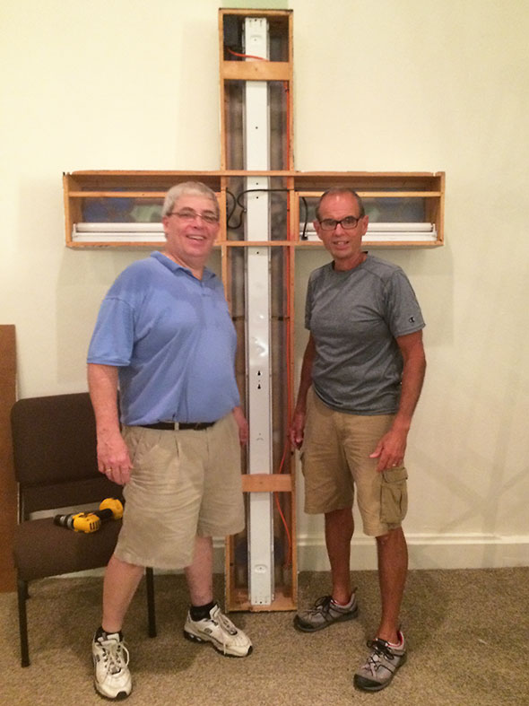 My husband took on the duty of managing the base. The cross was heavy, and he was sweating from effort by the time it touched down to the carpet. The unexpected intensity sent my husband to the adjacent church kitchen and refrigerator in the near desperate hope of finding refreshment. He found to his delight a can of regular Coke named Jessie in the refrigerator, solemnly swore to replace it in short order, and downed the drink. The hard part was over. When Jeremy returned to the sanctuary, he joined Gary and Rolf in setting the cross down carefully on its front. They marked the back panels Right, Left, Top, and Bottom, and removed the screws that held the panels to the back of the cross. Four sets of florescent fixtures lay underneath. The lightbulbs—at least the faulty ones on the arms—were simple to remove. However, the three trustees had other troubles. The florescent tubes had never been replaced before. Being almost 4 decades old, the fixtures had long become obsolete. No new florescent tube could fit the old fixture so the crew’s reengineering continued. For the moment, however, their work day came to end. Gary Blevins took the onus to replace the light fixtures, and the three men made a plan to reconvene Saturday afternoon and place the refreshed emblem back on its stately perch.