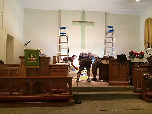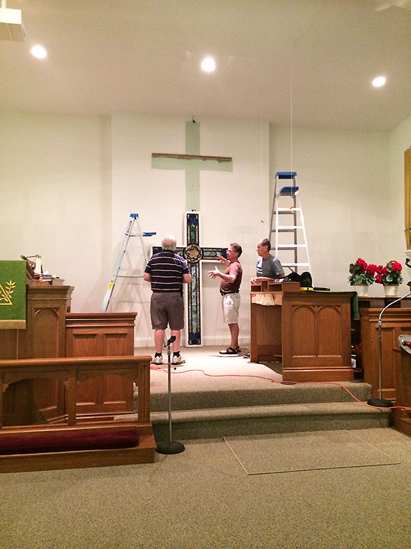 At this time, various church members began dropping by. They had come to do the prep work for last Saturday’s church barbecue. After delivering pies to the kitchen below, several stepped into the sanctuary to see our handiwork. I spoke to a person or two before my son came over to reel me back on task. He told me he was going to help Daddy ,and my job was to take pictures. Tipping up the cross back up against the wall, the four men considered the cross with satisfaction, all agreeing that the tin foil had succeeded in its purpose. As the older men negotiated their next moves, our son assigned himself the job of picking up, hauling scraps of foil and lose paper to the waste paper basket at the rear of the sanctuary. He helped the men reposition the ladders then, when asked, he stood back as Metzger and Blevins worked their way up their respective ladders.