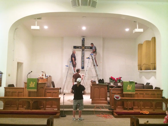 The cross was a great deal lighter which eased its upward trajectory. However, the work done in changing its fixtures had warped the wooden frame slightly. The warping was imperceptible to us all until we placed the cross on its high perch. I held one of the ladders steady as the men shimmied the cross along the wall looking for a best fit. In its final position, the right arm of the cross fit snug against the wall. Metzger fixed it in place with a single wood screw. The left arm, however, separated from the wall slightly so Blivens inserted a couple more screws on the left side to hold the cross securely aloft.