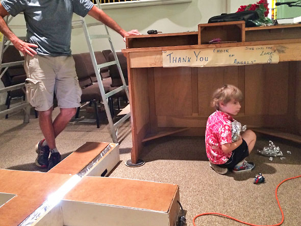 My son and I hopped forward to help…both of us simultaneously feeling in our element and that the project reached a juncture where it would benefit from our personal expertise. Blevins found a roll of aluminum foil in one of the church kitchens and ripped a couple of sheets off as the rest of us assembled the back panels according to their original positions: top, bottom, left, and right. We slipped the foil pieces underneath the panels for the arms, fastened all the panels into place, and then cut away the salvage aluminum foil. My son turned the men away from this duty as soon as the scissors came out. He knew he had this part. Together, he and I cut the overlapping foil away. We noted that the right and left back panels left a gap where the arms would rest on the ledge high above us. So, we cut the foil so that it overlapped the gap by a little and then tucked the salvage into the box at an angle. Tucked in, the reflective foil would cover the wood ledge without tearing as we fit the cross onto its perch.