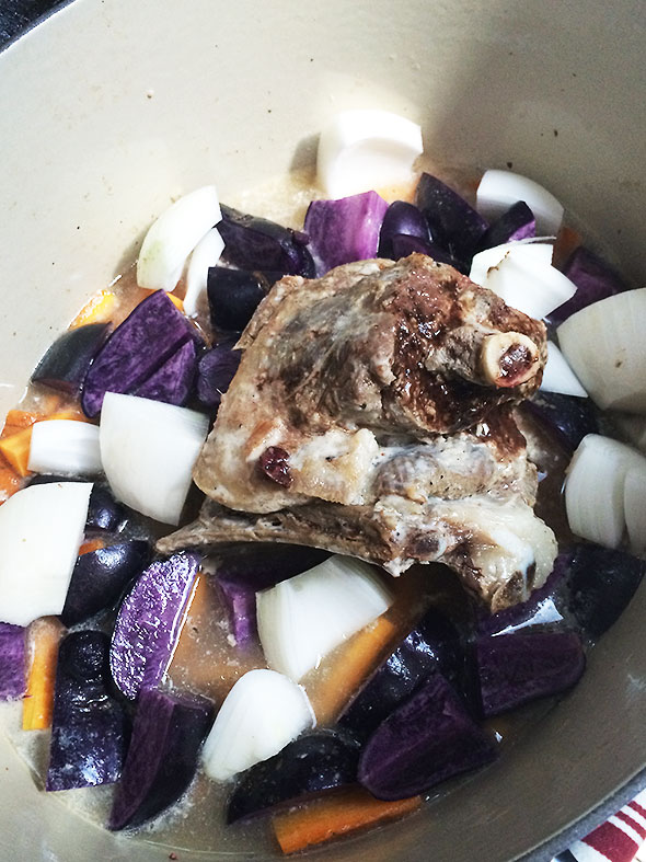 My husband defrosted a hind of goat meat yesterday. Having rubbed it down with horseradish, he is now browning it on the stove top. Collecting a group of root vegetables—-orange carrot, purple potato, white onion—he gives them a much needed bath and prepares them for temperature regulation. Jeremy rotates the meat to brown on all sides, then adds to its pan juices tumbling in large cut hunks of carrot, potato, and onion.