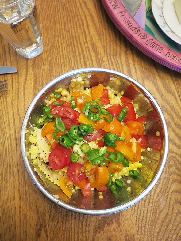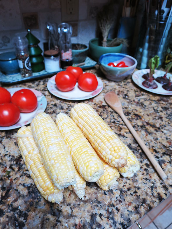 Jeremy and I reconvene, and together we divide ten ears of sweet corn into two groups. Six are husked while four cobs head straight to the grill to carmelize. I blanche the six ears in boiling water and then slice of their yellow white kernels for succotash. Our children sneak ribboned sections of sliced corn kernels for a sweet snack but I reserve enough to mix in with green peas, quartered cherry tomatoes, and sliced salsa pepper. I toss the vegetables with salt, a quarter cup of olive oil, and a splash of red wine vinegar.