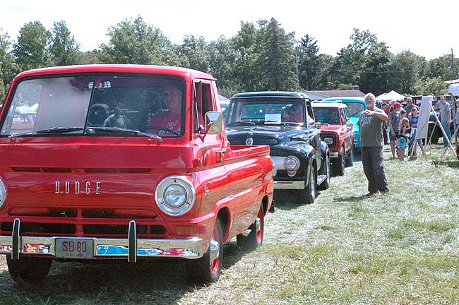 Organizer and publisher Patrick Ertel bids farewell to a few of the vintage trucks at the 14th annual vintage truck show last Saturday, Aug. 1, at Young’s Dairy. His magazine Vintage Truck hosts the event, which draws truck enthusiasts from across the country. Over 150 trucks were exhibited, from antique firetrucks to pickups to military transports. (Photo by Dylan Taylor-Lehman)