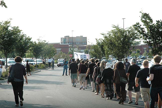Walmart closed an hour before last night’s event. The doors were shut and its managers were standing behind the glass, saying only that the store was closed for undisclosed reasons. A parade of customers walked to the doors and were turned away, and the parking lot was unusually empty for 6 o’clock on a Wednesday, aside from the news vans taking up one corner. The customers did not take the closing well and complained about the inconvenience, yelling across the parking lot at the demonstrators about the injustice they were suffering at not being able to shop. One man yelled so loudly that his children started crying.