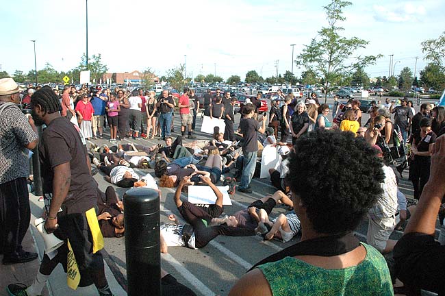 A die-in was scheduled, and a few dozen commemorators laid down in the parking lot in front of the entrance. A few participants were moved to tears and a few were shocked by the people who pushed their way through the demonstration, during the silence accompanying the die-in, to try to get into the store.