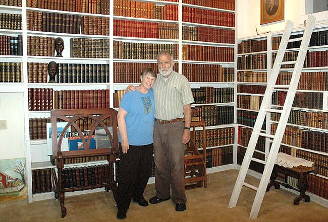 Jeanne and Hardy Ballantine stand in front of the extensive library of their North Walnut Street home. The couple have lived in Yellow Springs since 1973 and are relocating to Amherst, Mass., to be closer to their three children. Despite the excitement of a new place, bidding goodbye to Yellow Springs isn’t easy. “We’ve spent most of our lives here,” Hardy said simply. (Photo by Dylan Taylor-Lehman)