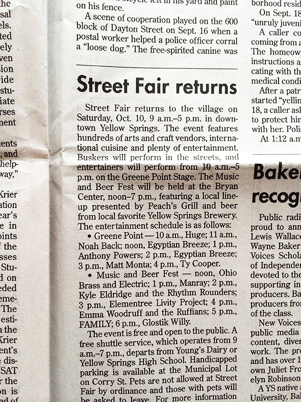 This summer, Jeremy was inspired to pull our material together again. He was asked to accompany the a cappella group Vocal Vortex on the Wailyin’ Jennys’ One Voice and, after a couple of outings, had caught music fever once again. He restrung his guitar and handed our cd to the organizers of the Yellow Springs Street Fair. We got picked up and are listed among the acts playing this October at Greene Point—the slice of lawn between Mills Lawn School and the Mills Park Hotel.