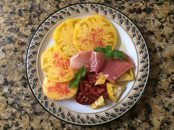 Once a tomato ripens, I slice through the fruit at its waist to reveal the inner flesh, sweet, splashing of juice, bejeweled by seeds. I dust the yellow, red, or apple-green flesh with a sprinkling of salt—or better yet—one of the flavored salts prepared by Louis Berrier of Weezy’s Garlic, Spices, and More. My special favorite has been Weezy’s Sunshine Blend which combines salt, black peppercorn, and dehydrated citrus rinds. The salt pairs perfectly with agrumato, a favorite dressing pressed from late season olives and citrus.