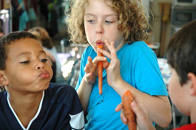 Antioch School students Antonio Chaiten, left, and Lucy Dennis participated in a two-day workshop on how to make pennywhistles out of carrots. The carving was led by Jonathan Crocker, of Theatre in the Ground Mudde Shows, who with his stage partner, Doug Mumaw, of The Swordsmen, will mount a show that’s new to this area including some of the Antioch School students from the workshop. Two “Meet the Wyld Man!” shows take place Wednesday, Oct. 7, at 12:30 and 7 p.m. at the Antioch College Amphitheatre. A feature story on the event will appear in next week’s News.