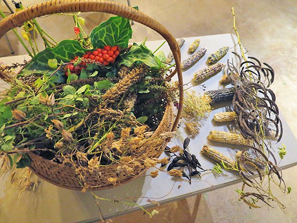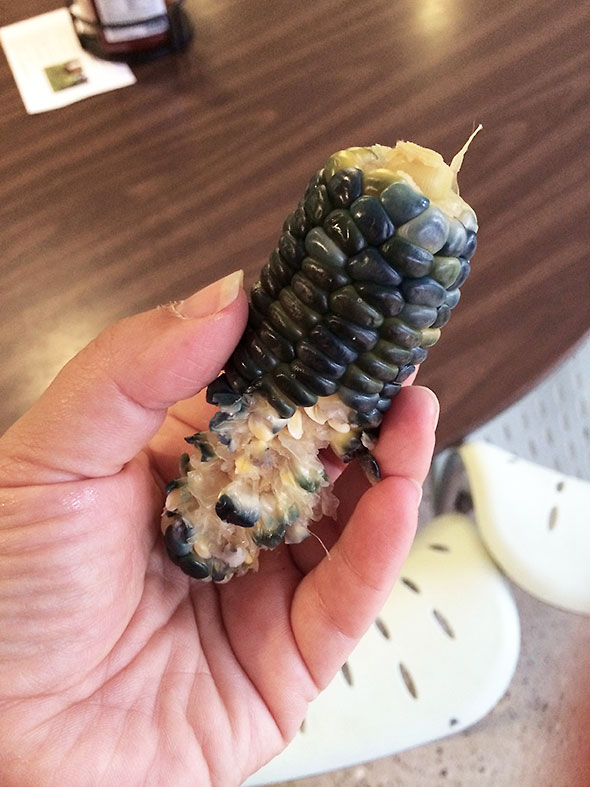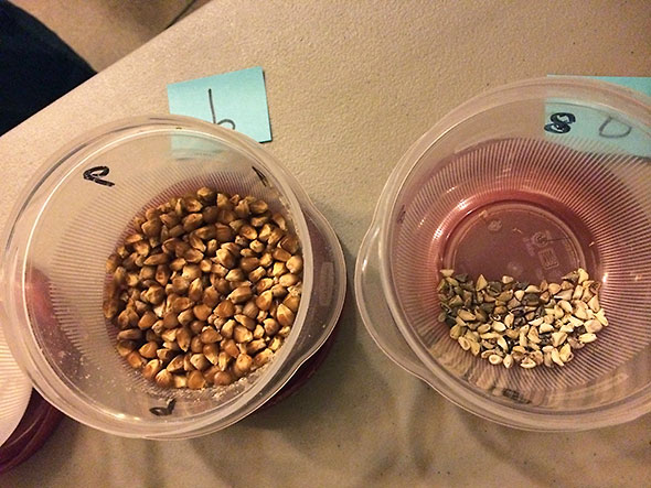 Among the seed samples, we examined examples of vegetable crop seeds and their wild counterparts. Corn was given particular attention. It’s a kind of grass best grown in plots of 100 plants or more to ensure vigor in pollination, the exchange of genetic material. The seeds of its wild parent teosinte look like bits of origami paper tightly folded into triangles. The difference between wild and cultivated was striking and, yet, their natural connection once demonstrated made perfect sense. Most of us know and love corn as sunny yellow kernels aligned in rows and wrapped about a cob of near standard length. The sameness of corn however is a modern invention. Edible corn is grown in sizes and colors of great variety. The difference in appearance is mainly skin deep. One student at Seed School brought a cob of blue pigmy corn that she grew at on her property. In examining the blue skinned kernels, we found that the inner flesh of the corn’s kernels were bright yellow. The flesh of the blue pygmy corn—a variety of notable quality—was sweet and good.