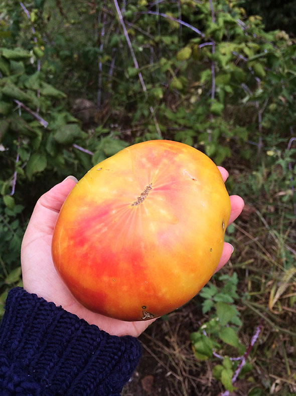 Like mass-produced corn, store-bought tomatoes are most noteworthy for their blah sameness. While the seed class was in session, I was plucking homegrown tomatoes from my garden, particularly from the vines that I planted among the black cap brambles in the front yard. The heat of the summer built up slowly this year and its delayed peak shifted the arrival of summer’s favorite fruit into late season. Still, I had little to complain over; I succeeded in growing my largest tomatoes ever in my most plentiful crop to date. Their vines supported by the black raspberry canes, my pineapple tomatoes swelled to the size of a softball and then even larger. The flesh within these beauties was bright yellow and, at their very heart, splashed red. They tasted so splendid that they demanded to be shared. I sliced up two at time and split their magnificence with our neighbors across the way. I brought a larger plate—salted and dressed in olive oil—to Seed School.