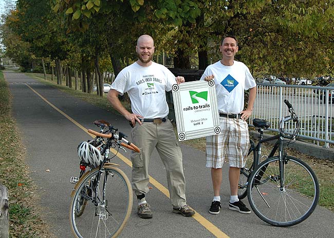 Rails-to-Trails Conservancy’s Erik Oberg and Brian Housh stand on the Little Miami Scenic Trail, holding aloft the placard that will hang in front of RTC’s new Midwest office on Xenia Avenue. RTC is a nonprofit that works with communities small and large to promote the creation of trails nationwide. (Photo by Dylan Taylor-Lehman)
