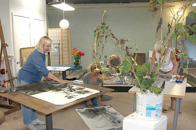 From left, artists Christine Klinger, Jennifer Rosengarten and Dennie Eagleson captured sunflowers in charcoal at an art sampler class taught by Rosengarten at the Yellow Springs Arts Council (YSAC) last Sunday, Sept. 20. The class drew its inspiration from “The Sunflower Show,” now on display at the YSAC gallery. (Photo by Audrey Hackett)