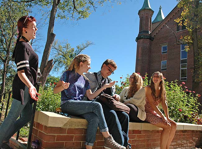 The fifth class of the revived Antioch College started classes this week. The 66 students, including, from left, Emily Langhardt, Kaitlin Staggs, Jonas Mufson, Rachel Isaacson and Helena Balcerzak, were attracted to the college because of its commitment to social justice, international co-op, small-town feel and unparalleled financial support. (Photo by Lauren Heaton)