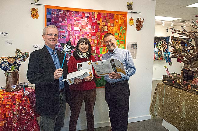 Yellow Springs Arts Council launched Art Roulette this week, a campaign to raise $30,000 by matching donors with “creative sparks” to artists who will make those ideas come alive. From left, YSAC board member Timothy Barhorst, gallery coordinator Nancy Mellon and President Jerome Borchers (with art by Sharri Phillips) are among the campaign organizers. (Photo by Audrey Hackett)