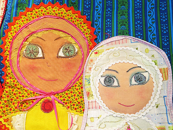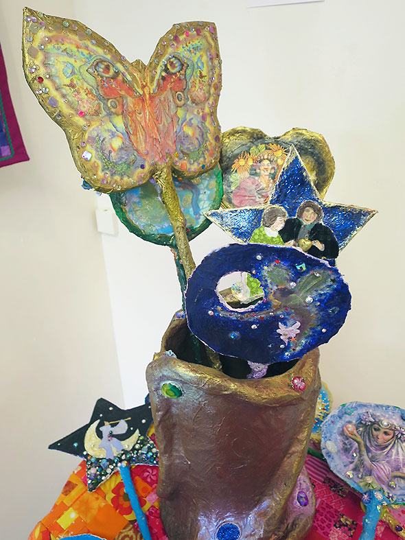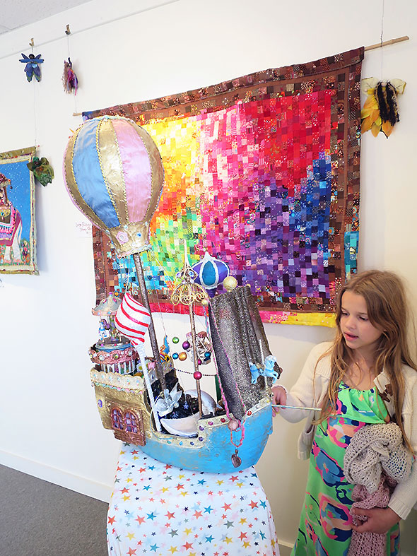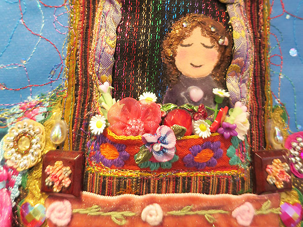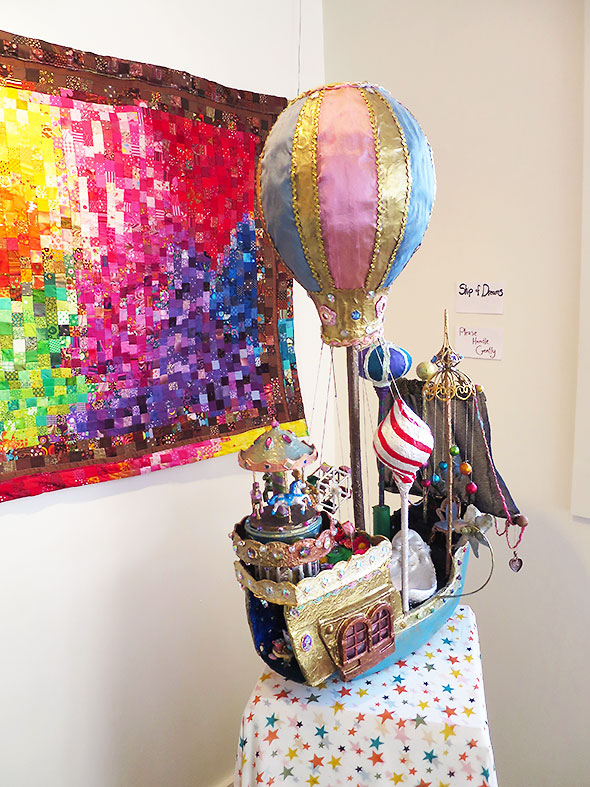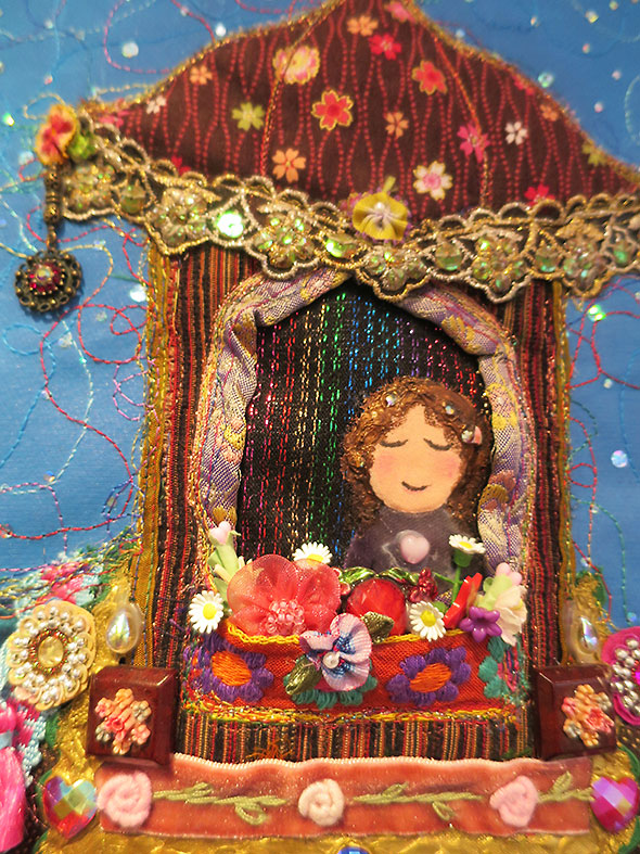 We find one piece that does indeed include a self portrait. The hanging quilt entitled Lucy and Me features a young woman with curly brown hair. She is riding atop an elephant. Her eyes are closed yet she smiles as if in the midst of a pleasing dream. Her canopied bed called a howdah is bejeweled by dangling garnet, a golden lattice, and exquisitely crafted cloth flowers. Her transport—a splendid gray elephant named Lucy—gets its namesake from Lucy the Elephant, a novelty six-story building that served as a lookout point and restaurant for a hotel south of Atlantic City, New Jersey.