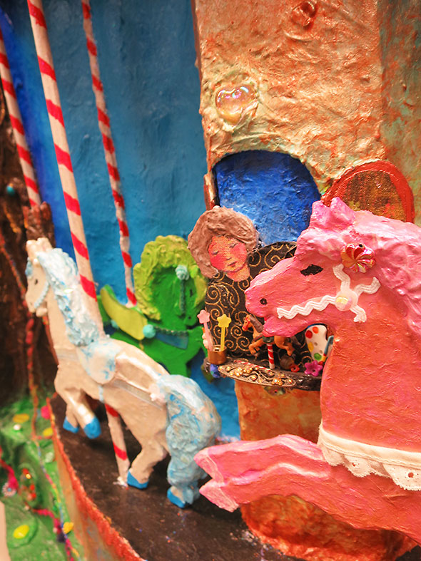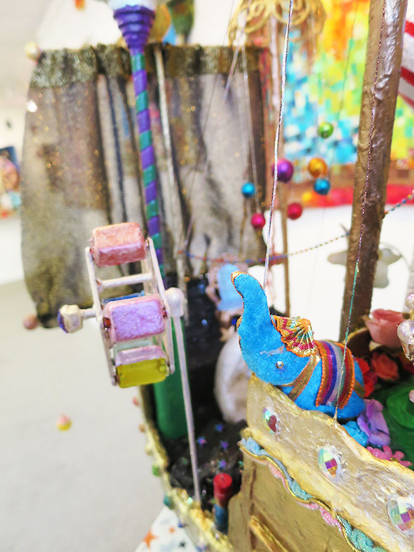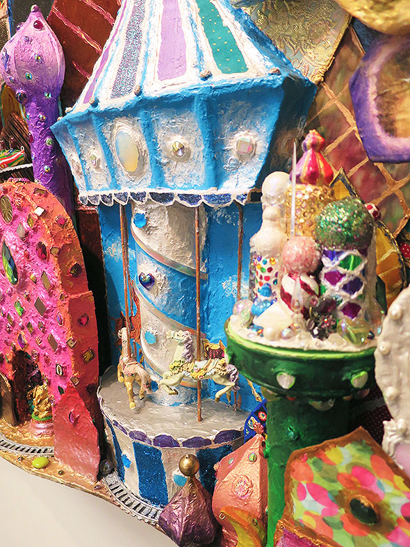 Phillips is a master of surprise. When we visit on Sunday, she demonstrates the working apparatus on the exhibit’s largest installation. My daughter’s jaw drops and we both marvel at the unexpected mischief in the piece. Dreamscape is a landscape synthesizing exotic Persian architecture with amusement park apparatus. Phillips rotates the three working ferris wheels and spins a carousel for us as we admire the many points of interest.