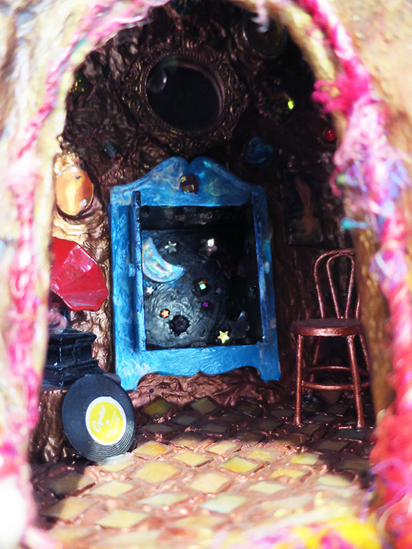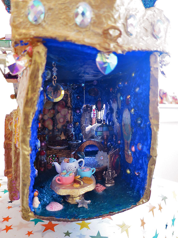 The details of Phillips’ work deepen the charm of each fantastic rendering: the crystal-like facets of her Russian nesting dolls, the star-filled nooks and cupboards, the blossoms garnishing sill and sash. Here is the music room with a phonograph. There, a the rocketship ride. A secret treehouse room. And who is this? A woman who charmingly like Phillips fashioning miniature horses within the booth of a carousel ride.