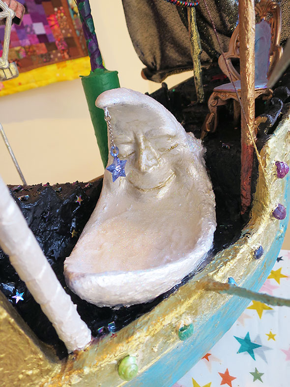 On the deck of her Ship of Dreams is a silver moon fast asleep and deeply content. Only the gentle scoop of its seat suggest it wants for anything…perhaps only a companion to cuddle close. Its vessel is finely appointed but fancifully. Instead of a ship’s wheel on the high deck, there is a spinning carousel. The main mast is in fact a hot air balloon of blue and pink silk embellished with gold. The quarters below deck are splendid and regal, a deep blue room filled with stars, stain glass, tea pots and tea biscuits, and dangling models of flying machines.