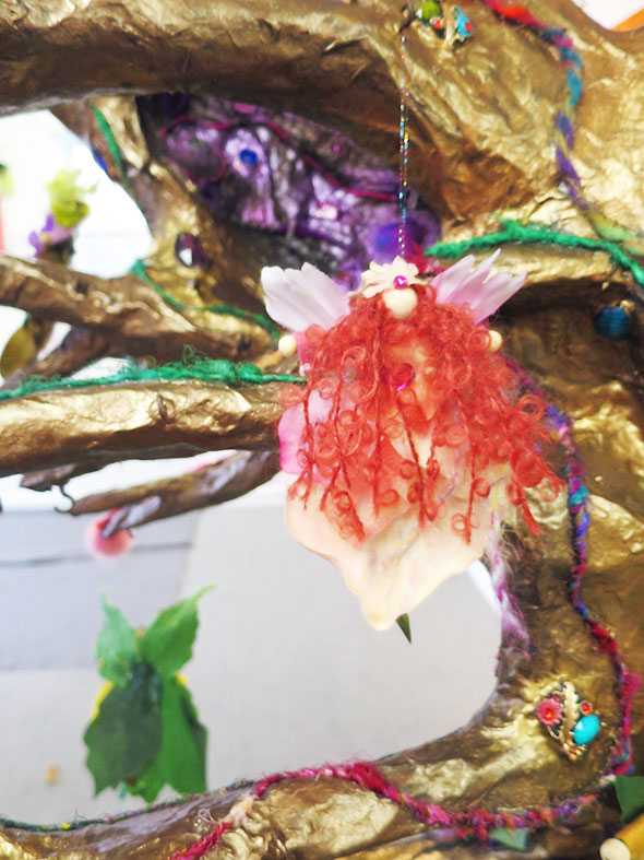 Along with the carousel horses, the comfy hideaways, and the canopied beds, Phillips’ exhibit is populated with curly haired fairies. They flutter about the room in a rainbow of colors. They line the window sill, descend from the ceiling, and decorate the golden treehouse at the heart of the exhibit. One red haired fairy has perched herself within the artwork at the base of a treehouse swing. She is tempted I’m sure to test its weight.