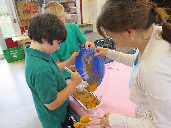 I’d been looking forward to the supper for some time. The older group’s teacher Chris Powell told me of her students’ plans to make breads…pumpkin, slow-rise white, corn bread, and challah. Still I was surprised at how much the children had accomplished by week’s end. The supper boasted several bread loaves and many crockpots of fine aromatic soups. I filled a bowl of stone soup proud and pleased as my daughter touting the goodness of her vegetable consommé. I also grabbed a wedge of white bread—such an excellent crumb that I was envious—and bowl of hot pumpkin soup garnished with a slip of cold cucumber soup.