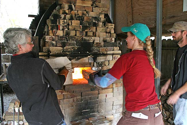 Friday evening, Nov. 6, members of John Bryan Community Pottery fired up their wood kiln for the fourth time this year. Nicki Strouss fed the fire while Carol Culberston held open the kiln door and Brad Husk passed over the wood. The kiln burned for 17 hours, reaching 2300º F. It will be a week before it’s safe to remove the brick and reveal how the wood ash melted on the ceramic pieces.