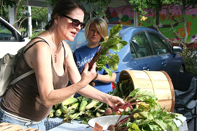 A series of free events focused on local food will kick off this weekend at 4 p.m. Saturday at McGregor 113 on the Antioch campus with a talk by Leslie Schaller of the Athens Food Venture Center. On Sunday, the film “Fresh” will be shown at the Little Art at 1 p.m., followed by a workshop at 3 p.m. at the library. Shown above is Alison Maier in 2014 at the summer Farmers’ Market, which is one component of a local food resiliency network, with Kara Baker of Springfield’s Baker Market and Greenhouse in the back. (Archive Photo by Suzanne Szempruch)