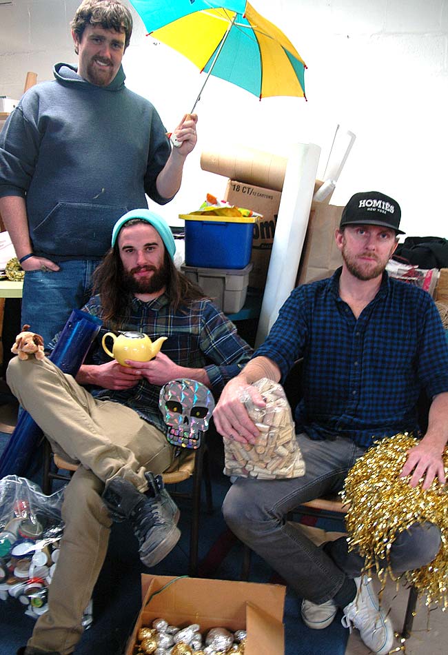 Nathan Foley, top with umbrella, Brandon Lowery, holding teapot, and Jesse Thayer, with pompom, are the artists who were locked up in the Arts Council Gallery for three days this week during Locked In: A Creative Collaboration. A reception for the project takes place Friday, Nov. 13, from 6–9 p.m. at the gallery, where the artists will speak about their experience at 7 that night. (photo by Diane Chiddister)