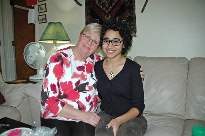 Antioch College student Jumana Snow and her mother, Susan, in their home. Mother and daughter moved to Yellow Springs from Jeddah, Saudi Arabia, in 2014 for Jumana to attend college. Coming here was a sort of homecoming for Susan, who grew up in the United States (in Vermont), but has lived in Saudi Arabia for 28 years. This is Jumana’s first time living outside the Middle East. (photo by Audrey Hackett)