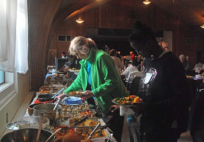 David Hendrix, Susan Snow and Antioch College student Jamana Snow successfully navigated the buffet line, and had piled-high plates to prove it. Organizers estimate that at least 400 people attended this year’s Community Thanksgiving dinner, the largest ever.