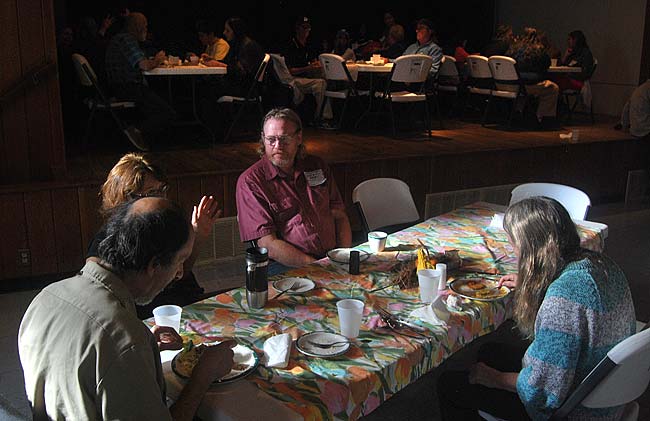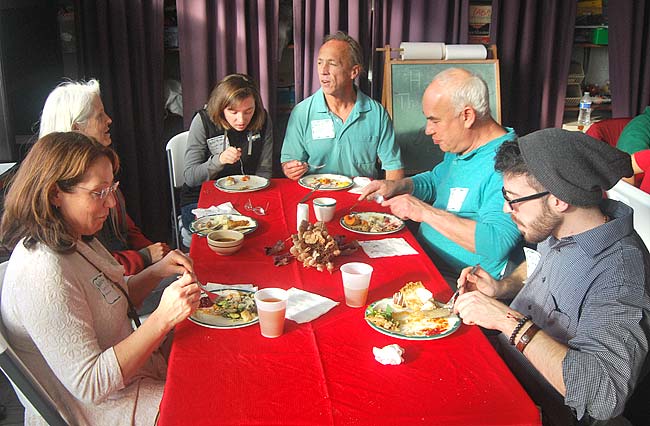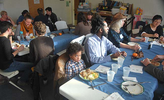 Ali Thomas, Charlotte Walkey, Rick Walkey and Dave Goodman, from top left in rear, were among those sharing food and conversation at the First Presbyterian Church, converted for an afternoon into a banquet hall for a potluck Thanksgiving feast.